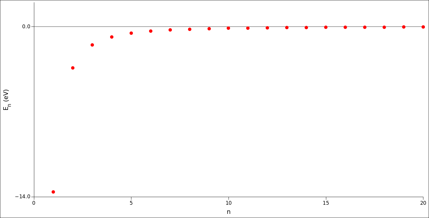 \[E_n=-\frac{\mu e^4}{8h^2\epsilon_0^2}\left(\frac{1}{n^2}\right)=(-13.61\ {\rm eV}) \left(\frac{1}{n^2}\right)\]