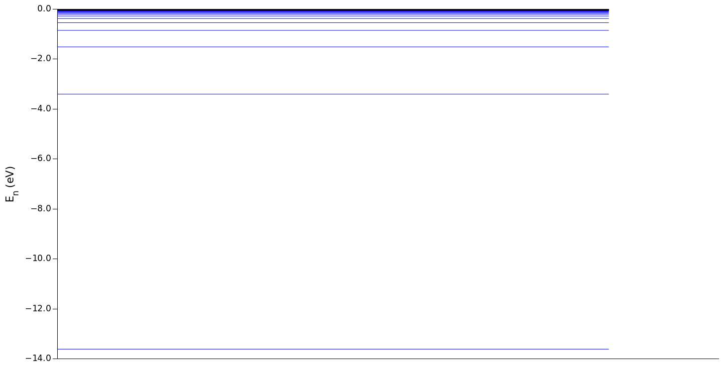 روش دیگری که برای نمایش حالات استفاده میشود مشخص کردن سطح یا تراز مقادیر انرژی است که در شکل روبرو نشان داده شده است. این نحوهٔ نمایش بسیار متداول است. همانطور که دیده می شود، با افزایش انرژی به سمت صفر، ترازها به هم فشرده می شوند و الکترون تقریباً هر انرژی میتواند داشته باشد. یعنی توزیع گسسته انرژی به توزیع پیوستهای که مربوط به ذرات آزاد است نزدیک میشود.