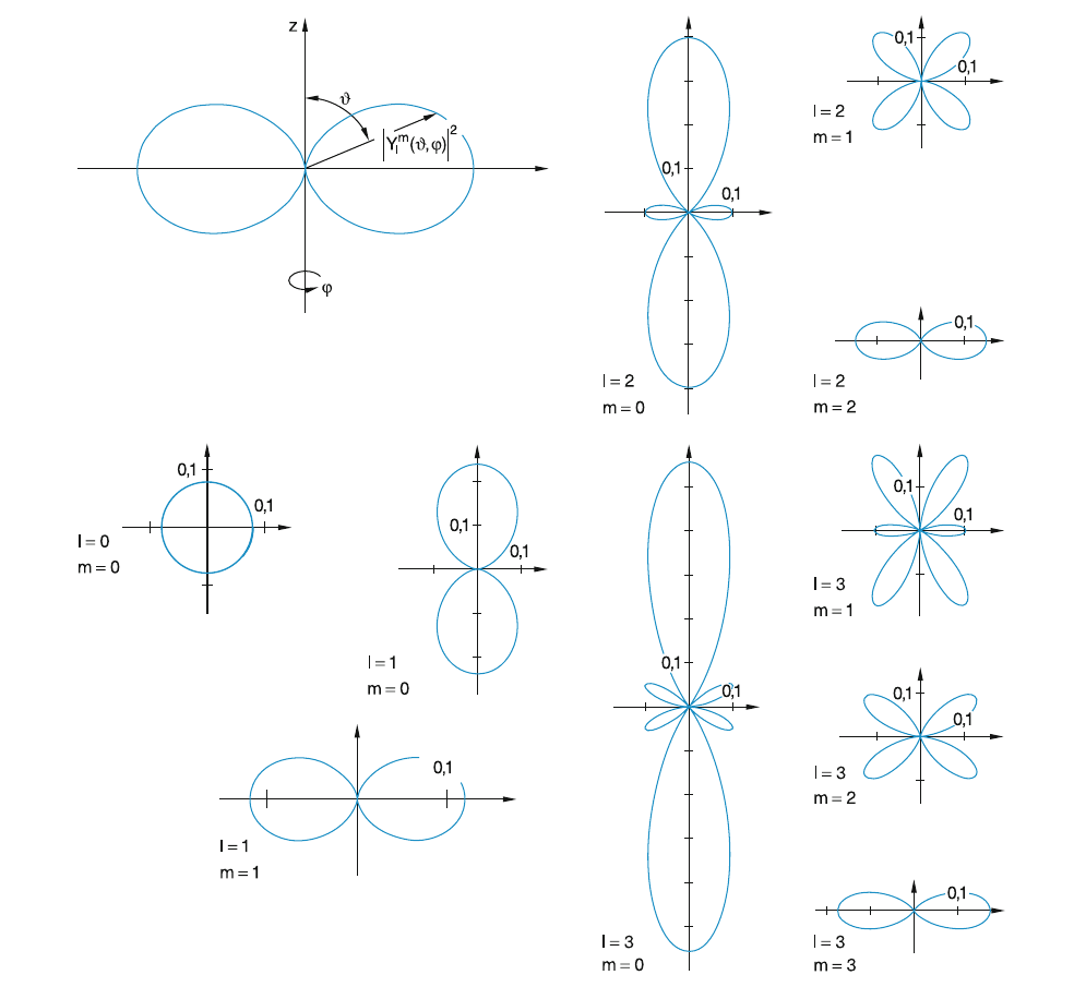 مجذور بخش زاویهای توابع موج یعنی توابع هماهنگ کروی \( |Y_{lm}(\theta,\phi)|^2 \)، با چگالی فضایی احتمال ذره در یک پتانسیل متقارن کروی متناسب است. شکل کلّی این وابستگیها در شکل روبرو (به نقل از مرجع [1]) بازای مقادیر مختلف \(\ell\) دیده میشود.