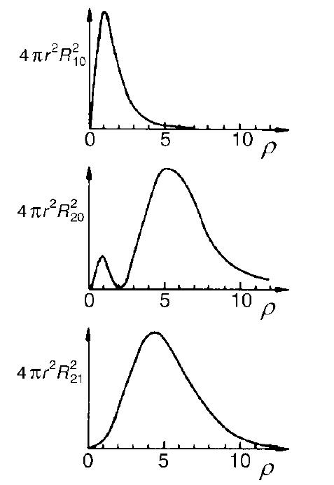 این تابع احتمال بازای چند تابع توزیع شعاعی مختلف در شکل روبرو (به نقل از مرجع [2]) به تصویر کشیده شده است. همانطور که دیده می شود در حالت اول یک بیشینه توزیع بار داریم که در \(\rho = 1\) اتفاق میافتد. حالت دوم دو بیشینه در \(\rho=0.77 \ ,\ \rho=5.24\) و حالت سوم یک بیشینه در فاصلهٔ \( \rho= 4\) خواهد داشت.