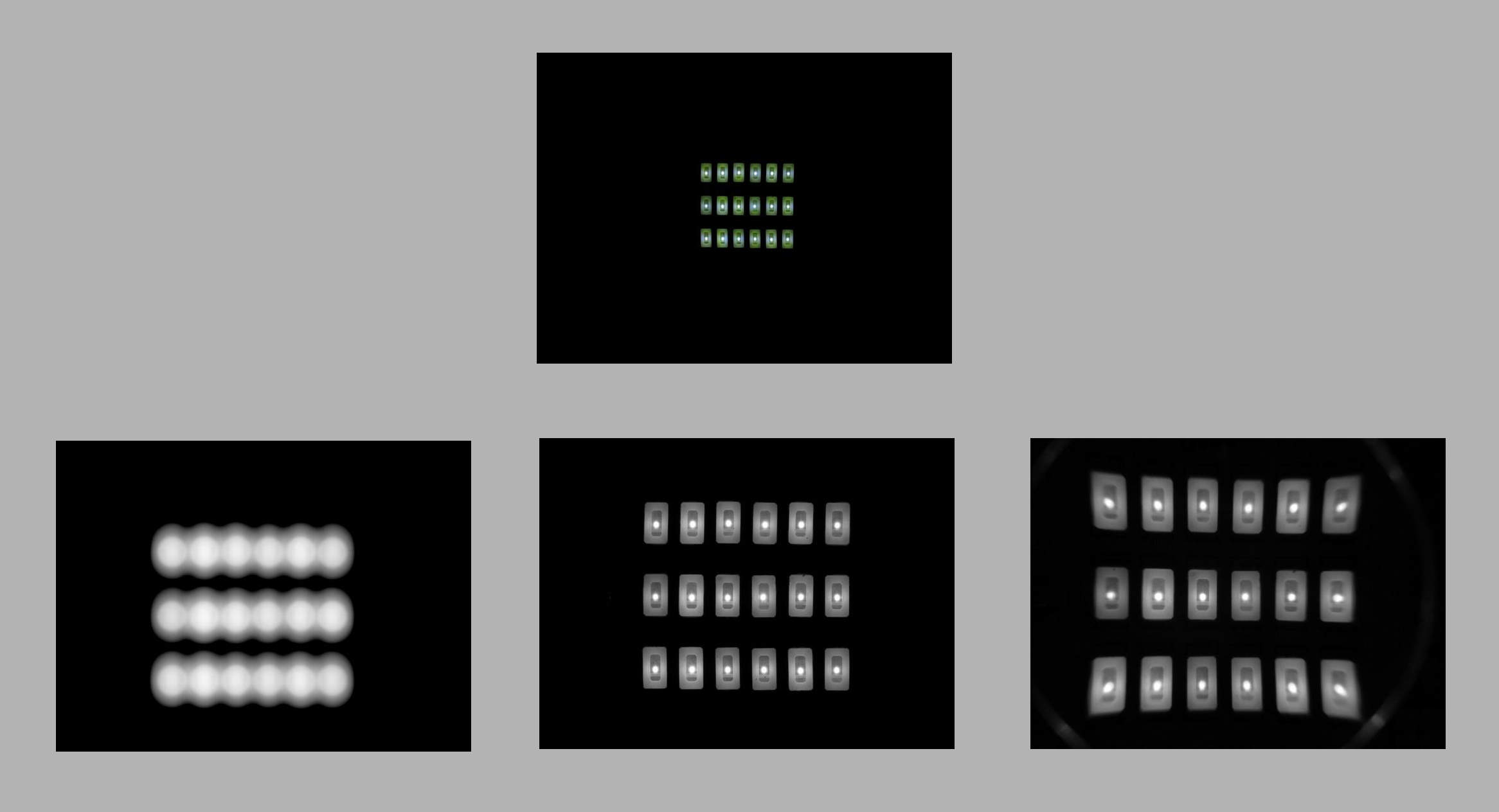 در ردیف اوّل چیدمانی از منابع نور تقریباً نقطهای دیده میشود که تشکیل یک جسم نورانی را دادهاند. یک سیستم اپتیکی در جلوی این جسم قرار گرفته است. سه حالت تصویرسازی در ردیف بعد نشان داده شده است. در حالت میانی، تصویر نسبتاً مناسب و قابل قبولی از جسم دیده میشود. در حالت سمت چپ، عملاً تصویر تشکیل نشده است، لکّههای نورانی در هم فرو رفته و تصویر واضح نیست. حالت سمت راست، تصویری با ابیراهی قابل ملاحظه را نشان میدهد. دیده میشود که تصویر با وفاداری، جسم را بازسازی نکرده است. تصویر، بخصوص در نواحی دور از مرکز اعوجاج زیادی پیدا کرده است. دقت کنید که هم ویژگی تک تک نقاط نورانی و هم ساختار کل چیدمان نقاط تغییر کرده است.