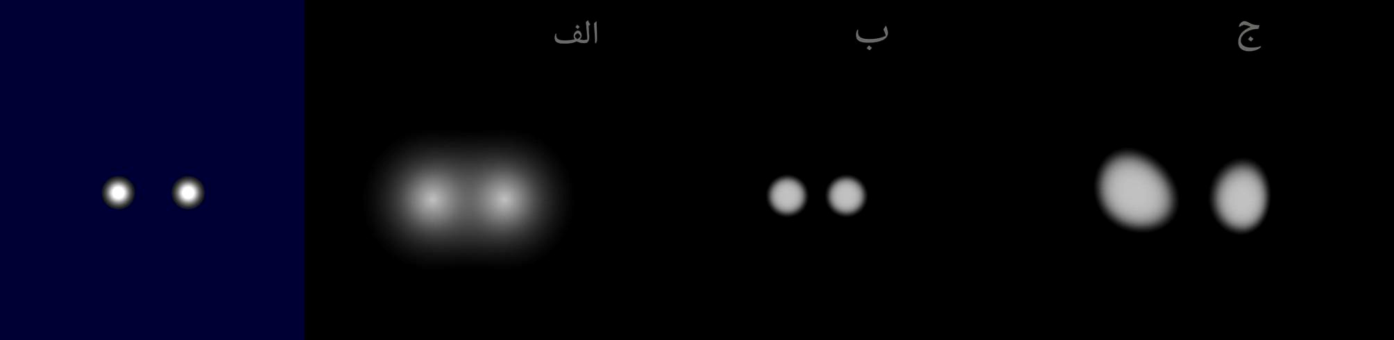 در شکل روبرو، تصویر حاصل از دو نقطهٔ نورانی در سه حالت دیده میشود. در حالت (الف)، سیستم در وضعیتی است که اندازهٔ لکّهها بزرگ است، تصویر نقاط محو است و دو نقطه بزحمت از یکدیگر تفکیک میشوند. میتوان گفت که عملاً تصویری تشکیل نشده است. در حالت (ب)، سیستم، تصویر مناسبی از جسم ساخته است. دو نقطه قابل تفکیک هستند اگر چه فاصلهٔ بین آن دو تغییر کرده است، امّا تناسب شکل حفظ شده است. به نسبت این فاصله به فاصلهٔ بین دو نقطهٔ جسم،