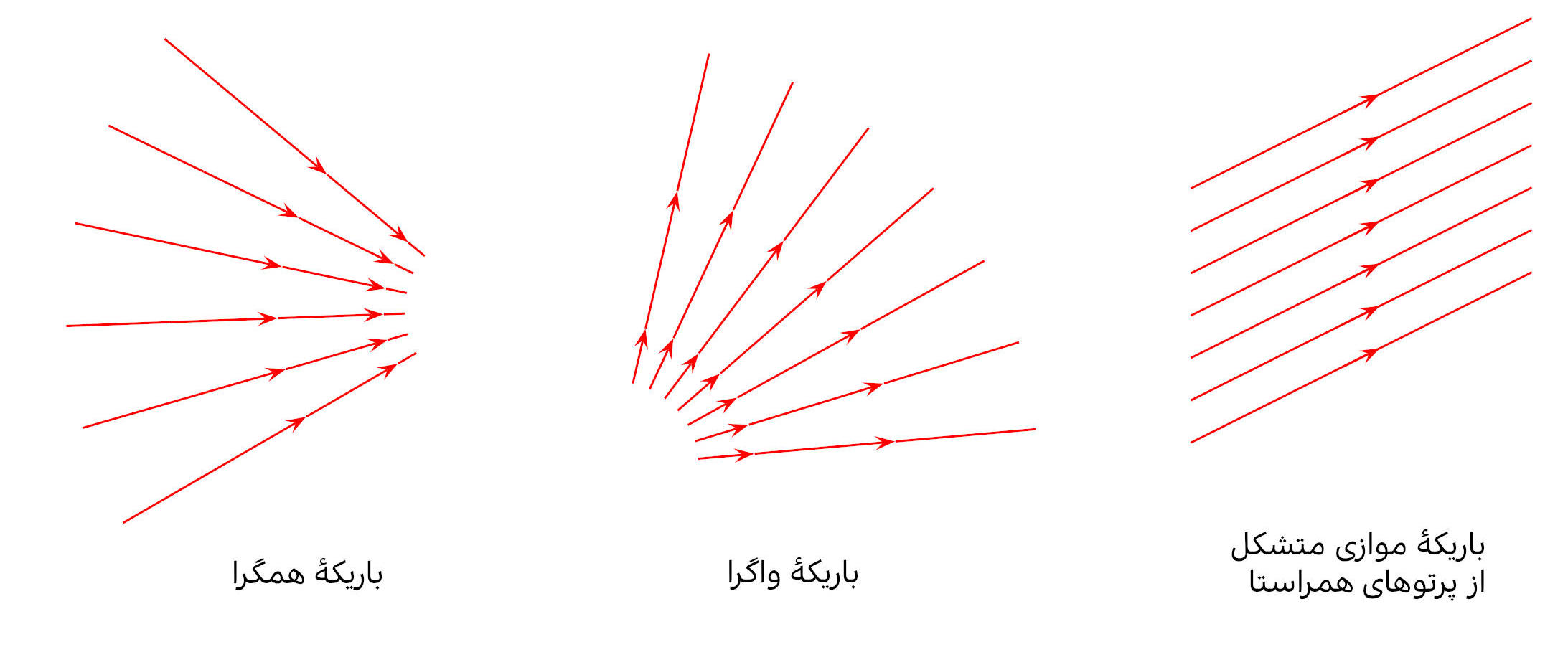 اگر یک منبع نقطه‌ای را در نظر بگیریم، طبق تعریف، نور آن در تمام جهات منتشر خواهد شد. می‌توان با قرار دادن مانع، عبور نور به یک ناحیه از فضا را محدود کرد. اگر در این مانع گسستگی یا شکافی باشد، نور از آن عبور خواهد کرد. در صورتی که این شکاف را کوچک کنیم، میزان نور عبوری و همینطور گستردگی آن محدود خواهد شد. با کم کردن متوالی قطر شکاف، به جایی می‌رسیم که نور خروجی تنها در یک راستا خارج می‌شود. در این حالت یک «پرتو»ی نور خواهیم داشت. اگر باز هم شکاف را کوچکتر کنیم، بر خلاف انتظار، نور مجدداً پخش می‌شود و اصطلاحاً پدیدهٔ پراش ظاهر خواهد شد (این پخش‌شدگی ناشی از اصل عدم قطعیت است)). بنابراین، پرتو، زمانی بدست می‌آید که بخش بسیار کوچکی از نور یک منبع را انتخاب کرده‌ایم امّا نه آنقدر کوچک که به ابعاد و محدودیت‌های پراش برسیم. یک پرتو نور در‌واقع کوچکترین خط فیزیکی ممکن است که در واقعیت به آن می‌توان رسید. اگر به جای یک شکاف، دو یا چند شکاف قرار دهیم، می‌توان چندین پرتو مختلف بدست آورد که هر کدام در راستای خاصی از فضا منتشر می‌شوند. با چند پرتوی نزدیک به هم یک «باریکهٔ نور» شکل می‌گیرد. باریکه، می‌تواند پهنای دلخواهی داشته باشد. در صورتی که پرتوهای یک باریکه همراستا باشند، باریکهٔ ما یک «باریکهٔ موازی» است (این حالت زمانی شکل می‌گیرد که در فاصلهٔ نسبتاً زیادی از منبع نور نقطه‌ای قرار داشته باشیم). در غیر اینصورت اگر پرتوهای باریکه موازی نباشند در بعضی از نقاط و جهتها ممکن است از هم دور شوند و یا ممکن است به هم نزدیک شوند. در این حالت می‌گوییم باریکه در آن ناحیه از فضا به ترتیب «باریکهٔ واگرا» یا «باریکهٔ همگرا» است. وضعیت «واگرایی» یک باریکهٔ نور در حین انتشار و عبور از محیط‌های مختلف ممکن است تغییر کند. مثلاً یک باریکهٔ‌ واگرا، ممکن است همگرا شده و سپس موازی گردد. اگر باریکه‌های نور به یک نقطه همگرا شوند، آن نقطه، می‌تواند جسم یا تصویر قلمداد شود. در‌واقع، این تعریف دیگری از جسم نورانی و تصویر آن است.
