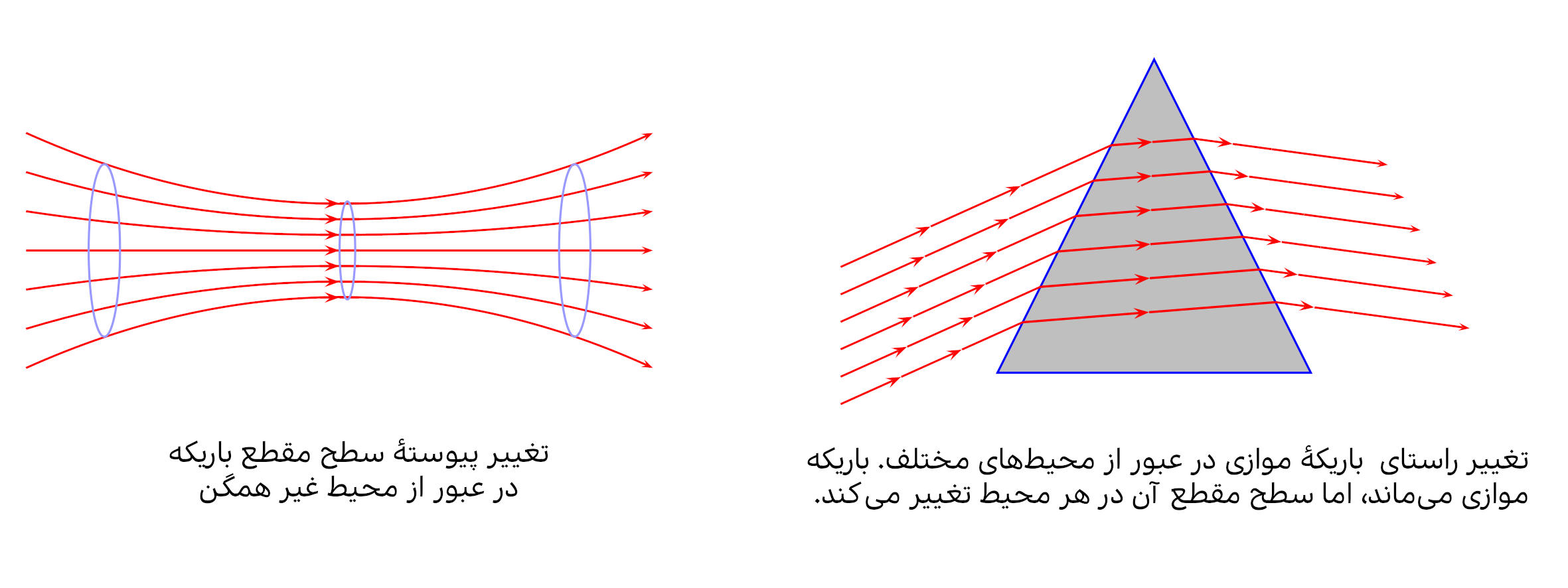 طبیعتاً سطح مقطع یک باریکهٔ همگرا و یا واگرا در حین انتشار تغییر می‌کند، امّا سطح مقطع یک باریکهٔ موازی هم لزوماً ثابت نیست. مثلاً ممکن است یک باریکهٔ موازی در یک نقطه از فضا سطح \(A_1\) را داشته باشد، امّا پس از عبور از یک مرز جدایی، سطح آن به \(A_2\) تغییر کند. از طرفی چون پرتوها و یا باریکه‌ها در فضای سه‌بُعدی منتشر می‌شوند، بنابراین ممکن است دو باریکه یا دسته پرتو در فضا همدیگر را قطع کنند و یا اینکه متنافر باشند، یعنی هیچگاه در هیچ نقطهٔ مشترکی از فضا قرار نگیرند.