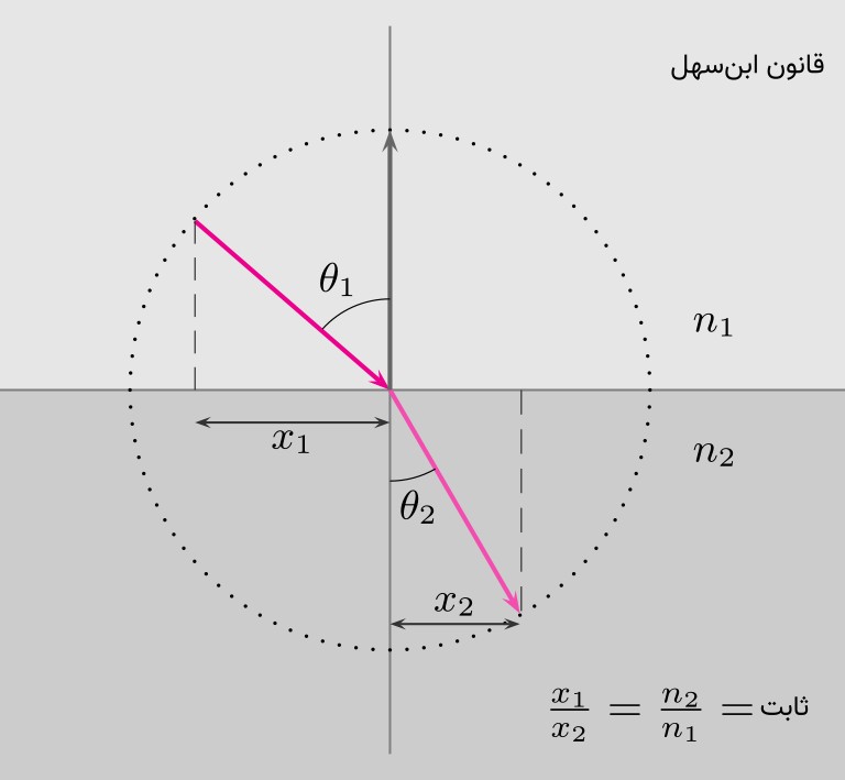 • نسبت مؤلفهٔ بردار پرتو فرودی در امتداد سطح به مؤلفهٔ بردار پرتو شکستی در امتداد سطح مقدار ثابتی است. این مقدار برابر با عکس نسبت ضریب شکست دو محیط است. به بیان ریاضی نسبت سینوس زاویه‌ای که پرتو شکست با بردار سطح می‌سازد به سینوس زاویه‌ای که پرتو فرودی با بردار سطح می‌سازد، بازای همهٔ زوایای پرتو فرودی مقدار ثابتی است، یعنی \[\frac{\sin(\theta_1)}{\sin(\theta_2)}=\frac{n_2}{n_1}.\] دراینجا \(\theta_1\) زاویه‌ای است که پرتو فرودی با بردار سطح می‌سازد و \(\theta_2\) زاویه‌ای که بردار شکست با بردار سطح دارد. \(n_1\) و \(n_2\) هم به ترتیب ضریب شکست محیط‌های اول و دوم هستند.