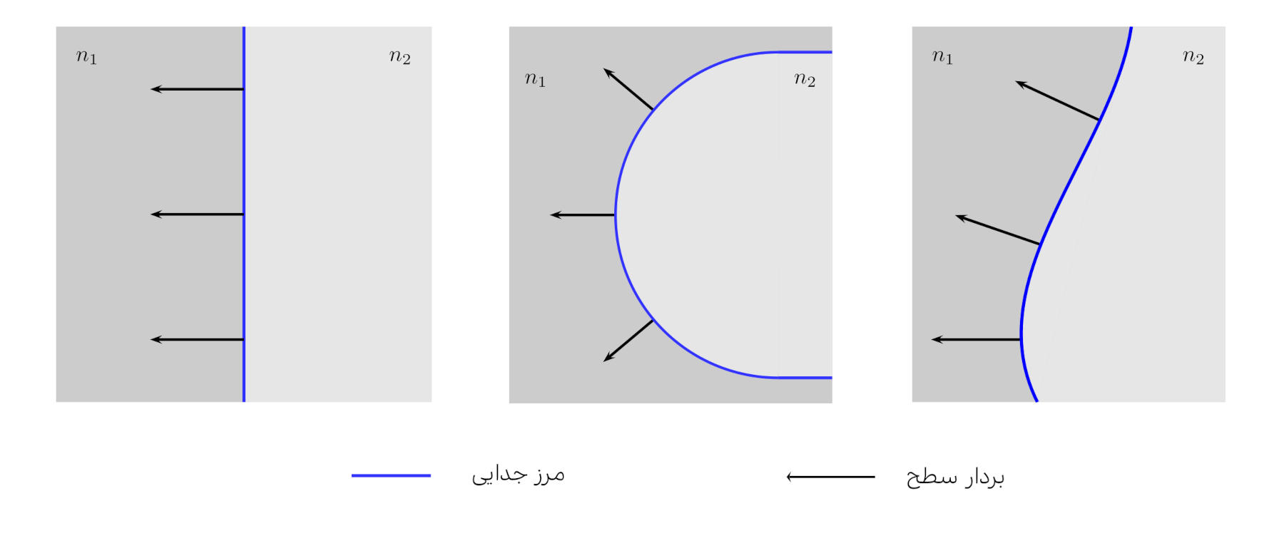 در مواردی ممکن است تغییرات ضریب شکست بصورت تیز و شدید باشد. یعنی در ناحیهٔ بسیار کوچکی از فضا، تغییر بزرگی در میزان ضریب شکست داشته باشیم. مثلاً اگر دو محیط با ضریب شکست متفاوت را در کنار هم قرار دهیم، (دو محیط که از آن‌ها با محیط ۱ و محیط ۲ یاد می‌کنیم)، تغییرات ضریب شکست در ناحیه‌ٔ انتقال از یک محیط به دیگری، بصورت ناگهانی و گسسته خواهد بود. به ناحیهٔ کوچکی که این تغییر در آن رخ می‌دهد، «مرز جدایی دو محیط» می‌گویند. این مرز جدایی توسط یک رویه یا سطح در فضا مشخص خواهد شد. در هندسه، رویه یا سطح با «بردار سطح» مشخص می‌شود. جهت این بردار، عمود بر سطح است. اگر مرز جدایی، یک سطح تخت باشد، جهت بردار سطح در تمام نقاط سطح ثابت و عمود بر سطح است. در غیر اینصورت، جهت بردار سطح در نقاط مختلف تغییر می‌کند.