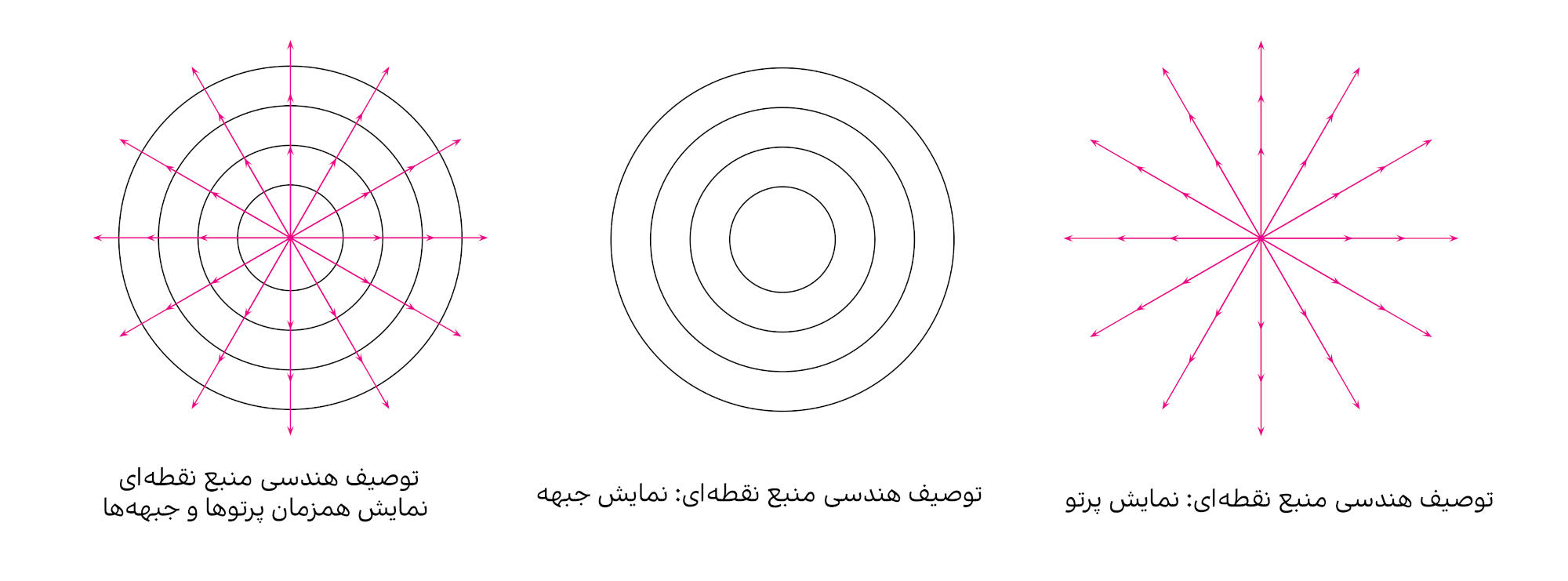 به عنوان مثال، دو توصیف هندسی برای منبع نقطه‌ای (یا تصویر نقطه‌ای) داریم. توصیف اول، خطوط واگرا (یا همگرا) از (یا به) یک نقطه در فضا است و توصیف دوم، رویه‌ای کروی که مرکز آن منبع یا تصویر نقطه است. علاوه بر این، مقطع این توزیع خطوط یا رویه را با هر صفحه‌ای در فضا می‌توان مشخص کرد. در این مثال خاص، تصویر منبع نقطه‌ای در تمام صفحات، مسیرهای دایروی را به عنوان مقطع جبهه و خطوط شعاعی در آن صفحه را به عنوان مقطع پرتوها تعریف می‌کند. در حالت کلّی، به همین ترتیب برای هر دسته پرتو یا باریکه‌ٔ نامتقارنی هم می‌توان پرتوها و یا جبهه‌ها را تعریف کرد. در اپتیک هندسی، نحوهٔ تغییر پرتوها و یا تغییر جبهه‌ها در حین عبور نور از محیط‌های مختلف بررسی می‌شود.