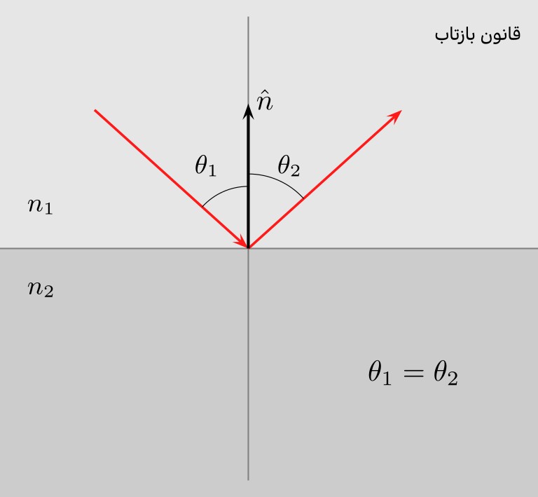 • زاویه‌ای که با بردار سطح می‌سازد، برابر با زاویه‌ای است که پرتو فرودی با آن می‌سازد. به بیان ریاضی: \(\theta_1=\theta_2\). در اینجا \(\theta_1\)، زاویهٔ پرتو فرودی با بردار سطح و \(\theta_2\)، زاویهٔ پرتو بازتاب با بردار سطح است.